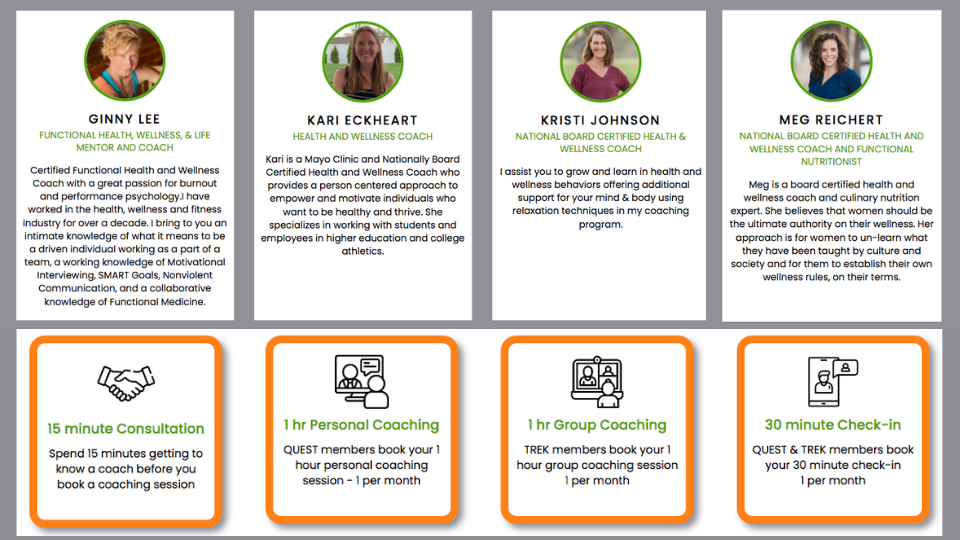 There are three paths to choose from - TREK, QUEST & EXPLORE. All paths lead to wellness, but are tailored for different personalities and needs. TREK & QUEST include holistic wellness coaching, plus access to all other therapies. EXPLORE is a self-guided journey. Do you want to travel with a group, go solo, or go off trail?